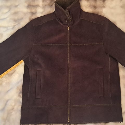 Denne jakken i nubuk skinn er mange år gammel, men så og si ubrukt. Den er helforet, og har en god tyngde.