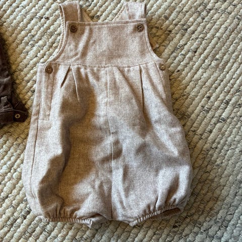 Wheat jumpsuit i størrelse 86. Buksen er laget i myk kordfløyel i lilla farge. Modellen har knapper i ryggen og trykknapper mellom bena for enkel av- og påkledning.