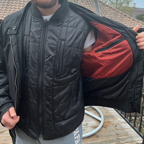 Gant vest for herre i størrelse XXL. Vesten er svart og har vattert, quiltet design med horisontale sømmer. Den har høy krage og glidelås i front. To frontlommer med glidelås gir plass til mindre eiendeler. Passer som ytterplagg på mildere dager eller som et ekstra lag under jakke i kaldere vær. Noe slitasje på glidelåsen, men ikke noe merkbart. Send gjerne melding dersom du har spørsmål eller vil se flere bilder av plaget:)