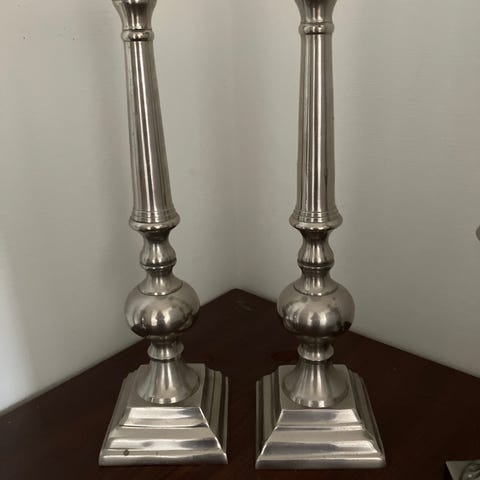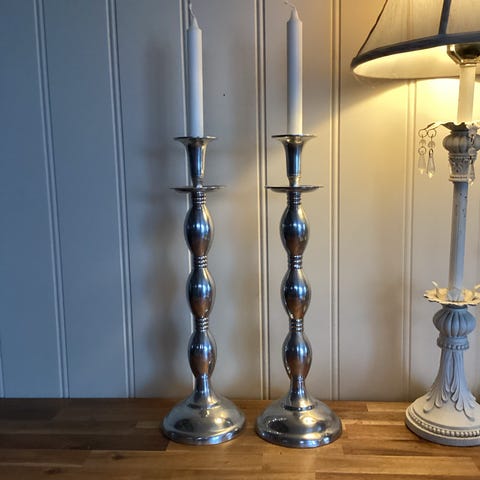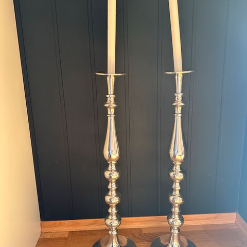 Selger et par stilrene og tidløse lysestaker i sølvfarget metall. De er ca. 40 cm høye og gir et elegant uttrykk både på spisebordet, i stuen eller som pynt på en skjenk.