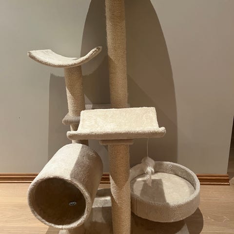 Klatrestativ for katt med rund hule nederst, to liggeplattformer i ulike høyder og hengende lekeball. Stativet har sisalomspunnede stolper som kan brukes som klorestolper. Overflater og liggeplasser er trukket i mykt, grått stoff. Egnet for innendørs bruk til lek, kloring og hvile for katt.