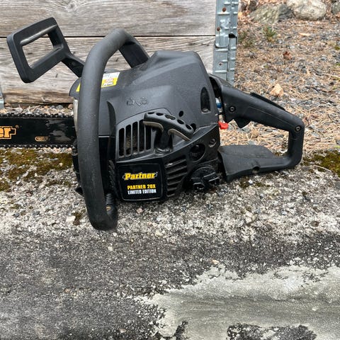 Partner motorsag selges nylig renset forgasser. Kutte lengde er 37cm. Av knappen er borte men er lett og stoppe den ved bruk av kabelen som er til siden lå bilde.