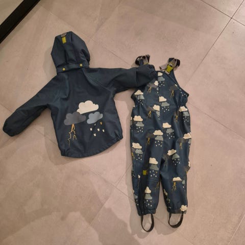 Pent brukt kattnakken regntøy og votter i str 92