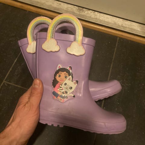 H&M gummistøvler for jente i størrelse 29. Støvlene er lilla med motiv av figur og katt og regnbue. Brukt. Veldig god stand.