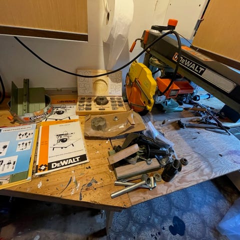Båndsag fra Clas Olson for tre- og eventuelt metallarbeid. Maskinen står på søyle og har justerbart sagbord for ulike kuttvinkler. Drives av elektrisk motor 3 fase. Det er tilkobling for sponavsug via rør under sagbordet. Passer til verkstedbruk der det er behov for presise lengde- og formkutt i materialer som trevirke og lignende. Det følger med noen sagblad i tillegg til det som står montert.