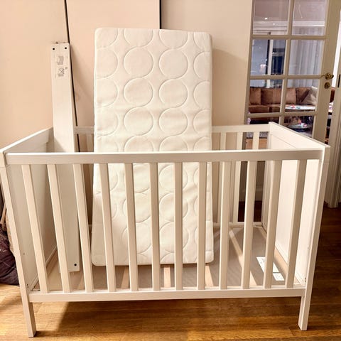 Sprinkelseng 91,5 (H) x 94,5 (B) x 46 (D) cm som kan brukes som bedside crib eller som vanlig seng.