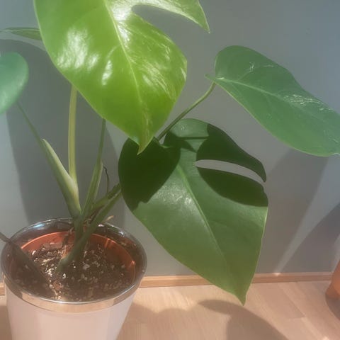 Monstera Variegata trenger et nytt hjem. Kom til meg som toppstikling og har vokst til en flott plante med 7 blader. Den trenger større potte og noe å lene seg mot, og jeg har dessverre ikke plass til det. Denne kommer til å bli stor og fin under de rette forholdene.