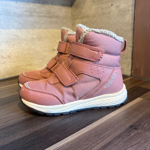Viking vintersko for barn i størrelse 31, unisex. Skoene er i rosa farge med to borrelåsstropper for enkel justering og av- og påkledning. Overdelen er i syntetisk materiale, og innsiden er fôret med mykt, varmt fôr som egner seg til bruk i kaldere vær. Sålen er i gummi med mønster for bedre grep på underlaget. Passer til hverdagsbruk i høst- og vintersesongen.