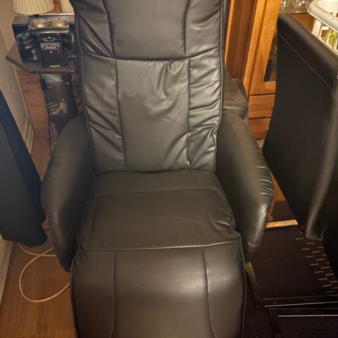 Pent brukt lenestol fra jysk. Type Recliner HADRUP svart imitert skinn. Noe av skinnet på hodeputen har begynt å sprekke litt. Men ikke veldig synlig.