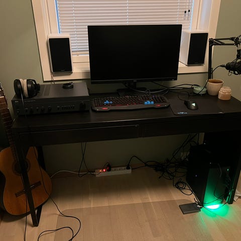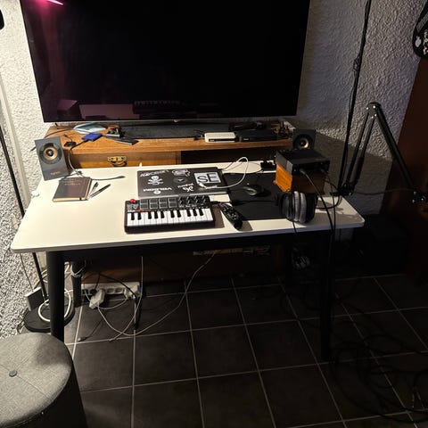 Denne pulten lagde jeg med et utgangspunkt for å kunne tilpasse kontoret uten å ha bordbein i gulvet. Den har også hull i hjørnet for ledninger til å komme seg ned under på en ryddigere måte.