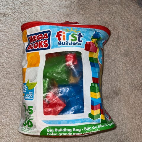 En liten pakke med mega bloks. Tre figurer, trær, noen vinduer, hjul