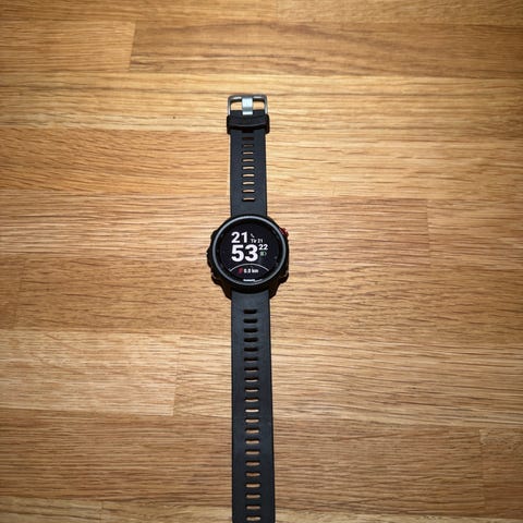 I hvit farge med silikonreim. Klokken har ingen synlige bruksmerker, reimen er helt ny og kjøpt direkte fra Garmin. Klokken har god batterikapasitet (holder i 10 timer ved konstant bruk under f.eks ultraløp).