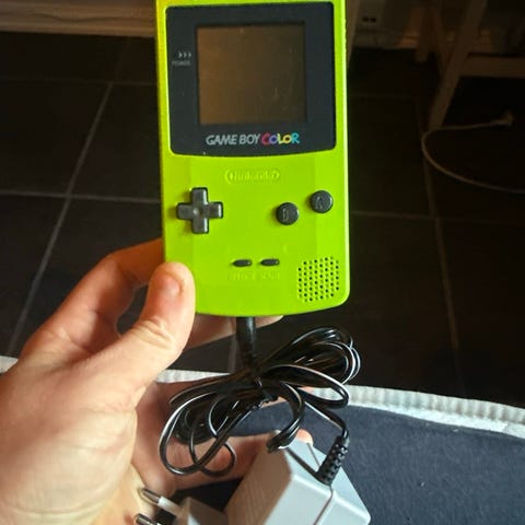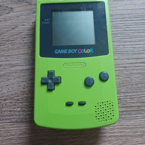 Nintendo Game Boy Color håndholdt spillkonsoll i grønn farge. Konsollen har innebygd fargeskjerm og tradisjonelle styreknapper på fronten. Batterilokket på baksiden er gult. Spillene settes inn i kassettåpningen på toppen av enheten. På bildene vises spillet Tetris DX satt inn i konsollen.