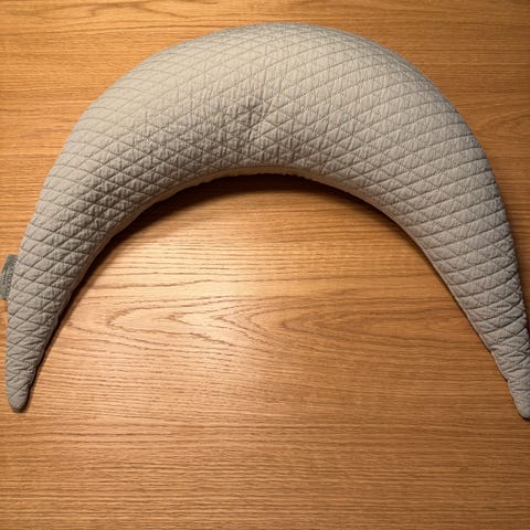 Bbhugme ammepute i grått med lyst sikksakkmønster. Puten har avtagbart trekk med glidelås, som gjør det mulig å ta av og vaske trekket ved behov. Formen gir støtte rundt kroppen ved amming eller flaskemating, og kan også brukes som støttepute i sofa eller seng. Designet for bruk av voksne som støtte ved amming av baby.