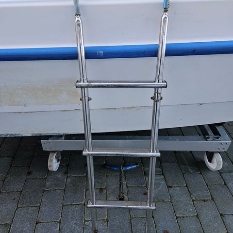 Nuova Rade badestige i rustfritt stål med 6 trinn, - selges til halv pris! Stigen er beregnet for montering på brygge eller båt, og har buede håndbøyler for enkel adkomst til og fra vannet. Trinnene er brede og riflede for bedre fotfeste. Leveres i metallutførelse med festeører for montering mot underlag.