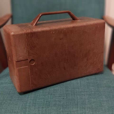 Dette er en brun retro smørbrødboks, ofte kalt "smørgåslåda".