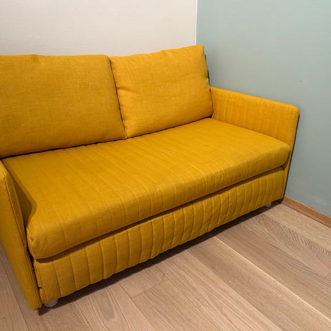 Sovesofa gis bort. God å sitte og sove i, og har fortsatt mye bruk igjen. Den har vært i bruk en stund, så en rens kan være fint, men ikke noe must. Hentes av den som trenger den 😊