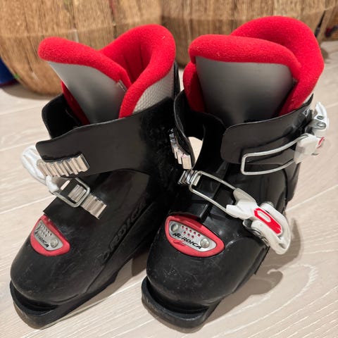 Nordica alpinstøvler for barn i størrelse 18.5. Støvlene har to justerbare spenner i metall for god tilpasning rundt fot og legg. Ytterskall i plast med innersko i polstret materiale. Fargekombinasjon svart, grå og rød med rødt innerfôr. Egnet til alpint bruk for barn som trenger en støvel i denne størrelsen.