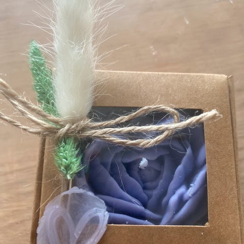 støpte blomster og 1 tre i 100% eco soya voks i fargen e dus grønn og beige. De er festet på små pinner som tas av og settes på lysfat som følger med , ( se bilde). Kommer i fin gavepose + porto