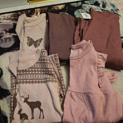 Pent brukt ull bambus klær fra hust and claire str 122. Finner ingen spesielle feil eller skader. Trøye, thights og hettegenser. Selges 550kr