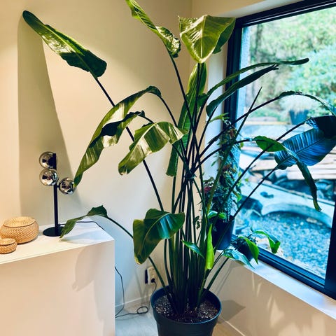 Kjempestor plante, går nesten helt i taket. Trenger nok større potte. Kommer stadig nye skudd. Bundet opp da bladene blir så tunge at de bøyer seg. Potte medfølger ikke, men kan fraktes i den og leveres tilbake.