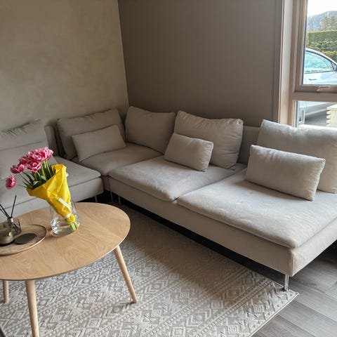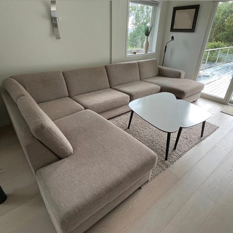 Pent brukt sofa med sjeselong og puff selges.. Sofaen er hel og pen. Nantes grå/beige stoff. Avtagbare trekk.