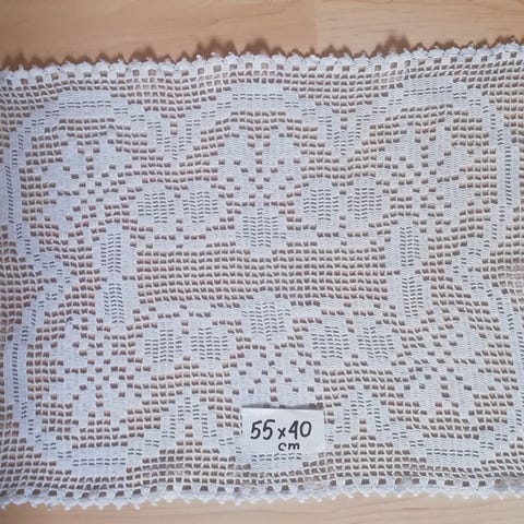 duk med blondemønster i hvit tekstil. Duken har utskåret heklet blondemønster kombinert med broderte blomsterdetaljer langs midtparti og kanter. Passer som bordduk til spisebord eller sidebord. Materiale og nøyaktige mål er ikke oppgitt.