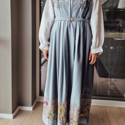 Sjekker interessen for denne fine oslo bunaden da jeg ønsker å bytte bunad. Passer fra xs-s. Den er sydd for og passe meg på 170, men kan justeres både på lengde og bredde. Følger i tillegg med liten hals sølje og beltespenne