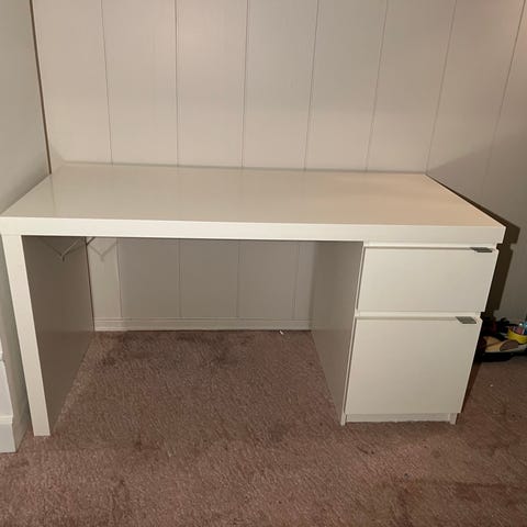 Bohus skrivebord i hvit utførelse med en mørk front på skuffen. Skrivebordet har en enkel, rett design med plate og sideplater ned til gulvet. Under bordplaten er det en uttrekksskuff som gir oppbevaringsplass til mindre gjenstander som kontorutstyr eller lignende. Egnet som lite arbeidsbord eller skrivebord i hjemmekontor, soverom eller stue.