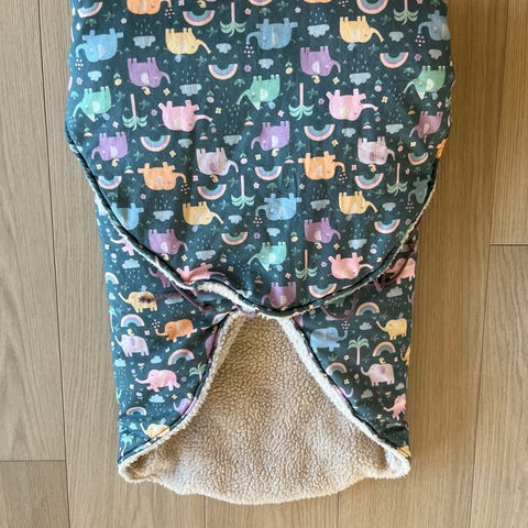 Selger et hvitt teppe til baby som er ment å brukes som en svøpepose, med knyting i midten og polstring inni.