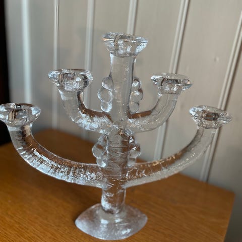 lysestake i klart glass. Lysestaken har tre armer og plass til tre stearinlys. Overflaten er boblete