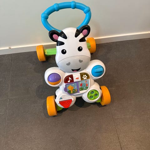 Fisher-Price gåvogn i sebra-design for småbarn. Gåvognen har håndtak for støtte når barnet øver på å gå, og fire hjul for stabilitet. Fronten har flere aktivitetsknapper og dreiehjul i ulike farger som kan brukes til enkel lek og stimulering av motorikk. Passer som støtte når barnet skal trene balanse og koordinasjon innendørs.