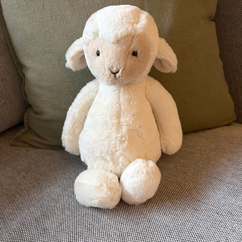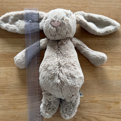 Vi selger en ny Jellycat kanin. Kaninen måler 31cm x 12cm x 9 cm, og har en sittehøyde på 23 cm. På grunn av en liten skade (stivhet i stoffet ol) på baksiden av kaninen, i "pelsen" så selger vi kaninen billigere.