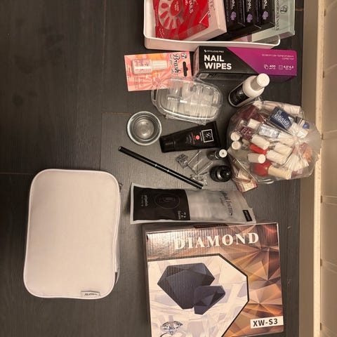 Blandet pakke med negleutstyr og tilbehør. Inneholder ulike produkter relatert til neglepleie og negledesign, blant annet Uv-lampe, elektrisk neglfil & masse annet nødvendig for å fikse neglene selv!