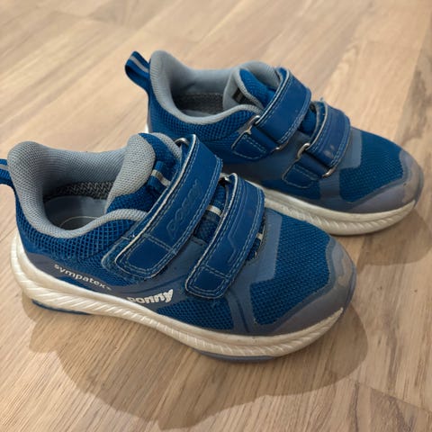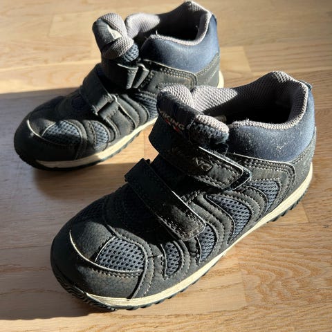 Viking overgangssko for barn i størrelse 34. Skoene er unisex og har overdel i blått materiale med grønne detaljer. Lukkes med to borrelåsstropper over vristen for enkel av- og påkledning. Yttersåle i gummi med mønster for grep. Egnet som hverdagssko og til lek både inne og ute.