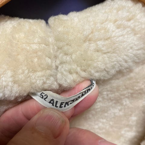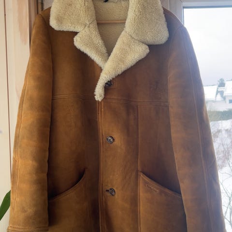 Aleksander of Norway vinterjakke for herre i størrelse M. Jakken er laget i brun semsket skinn med lys, myk innside. Den har klassisk krage med fôr, knappelukking foran og store frontlommer. Passer som varm ytterjakke i kaldere vær.
