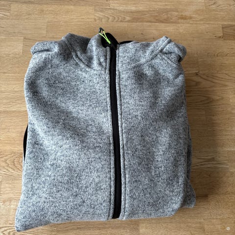 Praktisk jakke i fleece med glidelås som kan brukes på begge sider dvs. vrenges. Lommer på begge sider. Kan strammes nederst. Merke CLIQUE, modell KAESER (?). Materiale nylon/polyester. Midt i blinken på arbeid utendørs eller i kjølige lokaler, på jakt eller tur. Alder ukjent, men er nok minst 5 år gammel. Lite brukt og følgelig lite aldersrelatert slitasje.