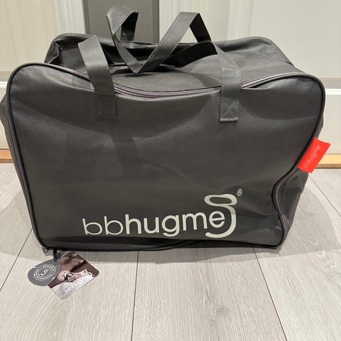 Bbhugme gravidpute med grått trekk. Settet inneholder pute, trekk, to gule endestykker og oppbevaringsbag. Puten kan formes ved at man justerer med de to gule endestykkene, og kan brukes som støtte under graviditet og ved amming. Veldig god for å avlaste kroppen ved for eksempel bekkenleddsmerter. Trekket er nyvasket. Det er en liten rift i stoffet på trekket, som vist på bilde.