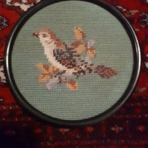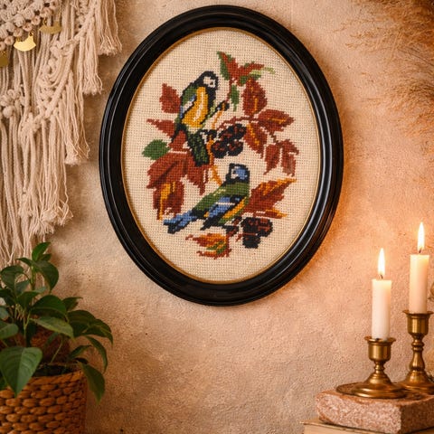 #vintage #broderi #veggbilde #retrointeriør #koselig #håndarbeid #fugl #skandinavisk