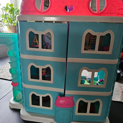 To Gabby dukkehus selges med noen møbler og Gabby figurer. Mangler noen vegger i papp innvendig.