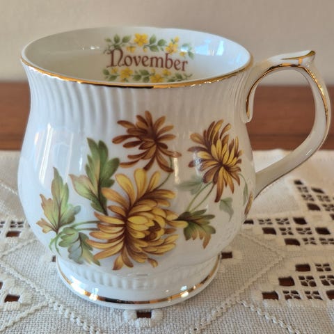 Krus med blomstermotiv og teksten "November" på innsiden.
