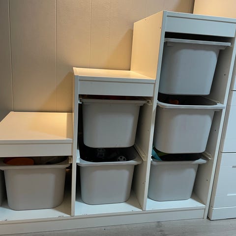 Trofast veggoppbevaring i hvit fra IKEA. Pent og lite brukt, nesten ingen bruksmerker. Skruer til veggen føler ikke med. Obs: kun 5 plastkasser følger med.