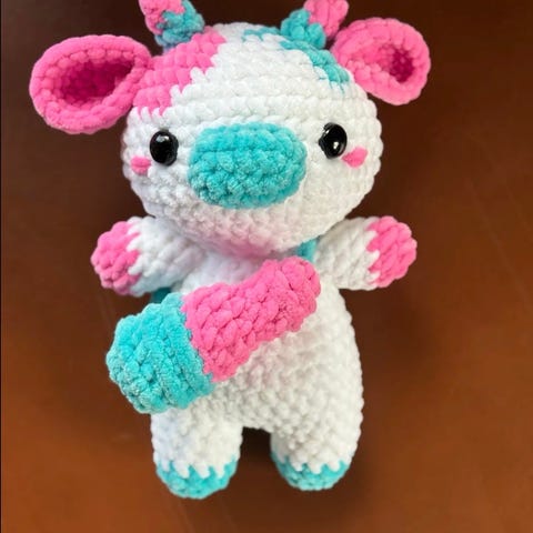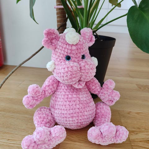 Nye håndlagede kosedyr. To figurer i mykt, heklet chenille garn, i røde og rosatoner. Passer som kosedyr eller dekor på barnerom. Høyde ca 35 cm.