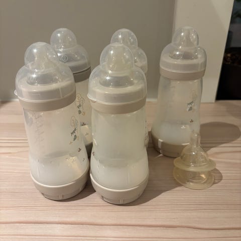 MAM tåteflasker i plast i ulike størrelser, hovedsakelig i hvit og beige farge, kun en blå. Flaskene har tydelig måleskala på siden og brede smokker. Egnet til mating av spedbarn og småbarn med melk eller annen drikke.