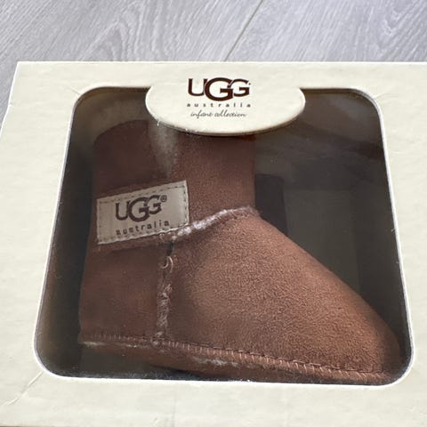 UGG babysko i brun farge. Myk utside i semsket skinn og innside i saueskinnsfôr. Modellen har myk såle uten gummisåle, egnet som varme og komfortable tøfler til baby. Åpning med borrelås på siden for enklere av- og påkledning. Passer til bruk innendørs eller i vogn/ bil for ekstra varme rundt føttene.