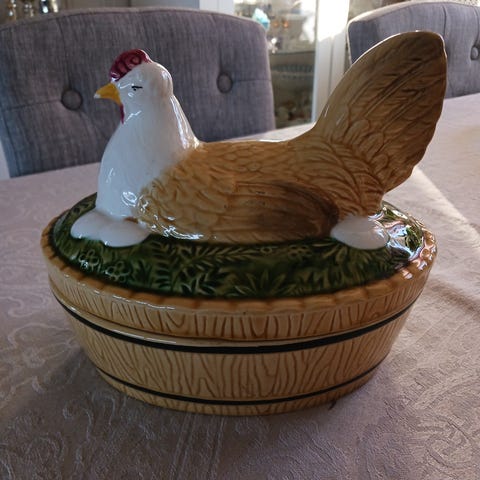 Eldre egghøne i pressglass