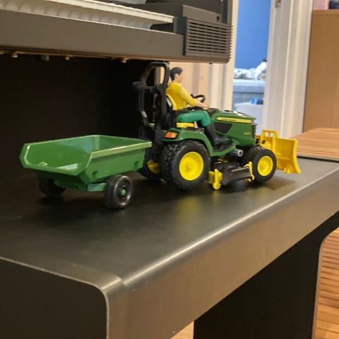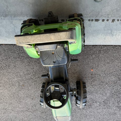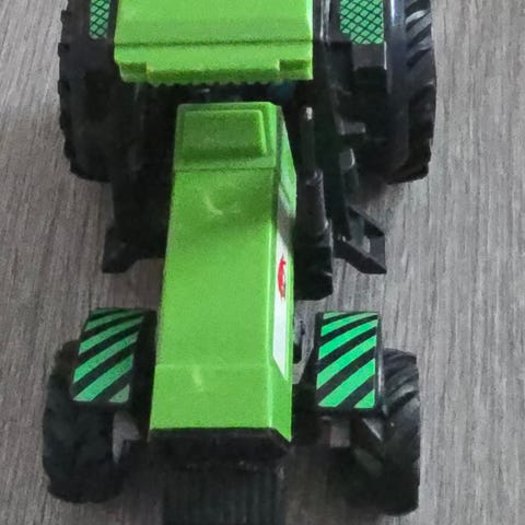 leketraktor skurtresker i plast. Modellen er grønn med grå og svarte detaljer og store gummilignende hjul. Lastearmen kan svinges ut til siden. Egner seg som lekekjøretøy for barn som liker landbruksmaskiner, og kan brukes både inne og ute på egnet underlag.
