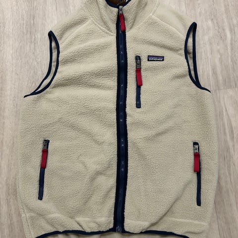 Patagonia vest i fleece for herre i størrelse XL. Vest i hvit, myk fleece med hel glidelås i front. Modellen har høy krage og kontrastdetaljer langs glidelås og kanter. Flere glidelåslommer foran, inkludert brystlomme. Egnet som mellomlag eller ytterplagg i mildere vær, til hverdagsbruk og friluftsaktiviteter.