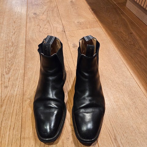 Brukt en håndfull ganger på jobb. Svært flotte, men selges da de er et ørlite hakk for store for meg. Bærer ikke preg av bruk. Skotrær følger ikke med.