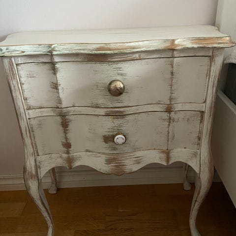 Vakker & nett liten lysmalt kommode i rokokkostil fra 50-tallet. Den har vært i en families eie - en liten vintageskatt❤️ Pent brukt & i god stand.